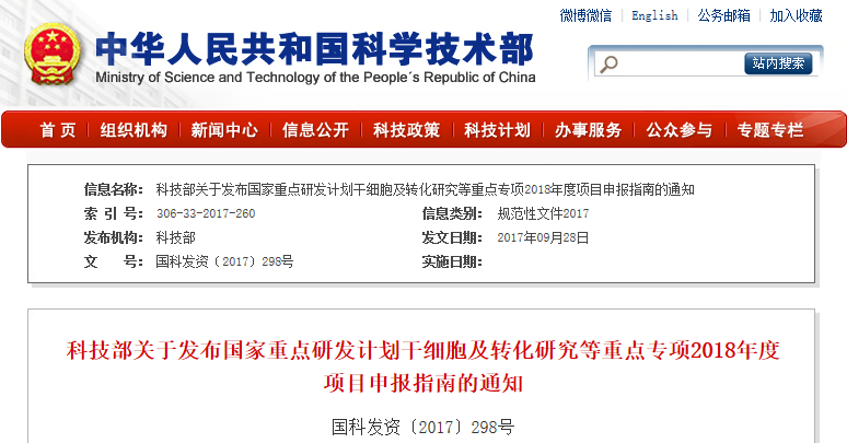 國科發(fā)資〔2017〕298號附件1“干細(xì)胞及轉(zhuǎn)化研究”試點專項2018年度項目申報指南為取得干細(xì)胞及轉(zhuǎn)化研究的原創(chuàng)性突破和推動轉(zhuǎn)化應(yīng)用,整體提升我國再生醫(yī)學(xué)領(lǐng)域水平,根據(jù)《國家中長期科技發(fā)展規(guī)劃綱要(2006-2020年)》部署和《國務(wù)院關(guān)于深化中央財政科技計劃…