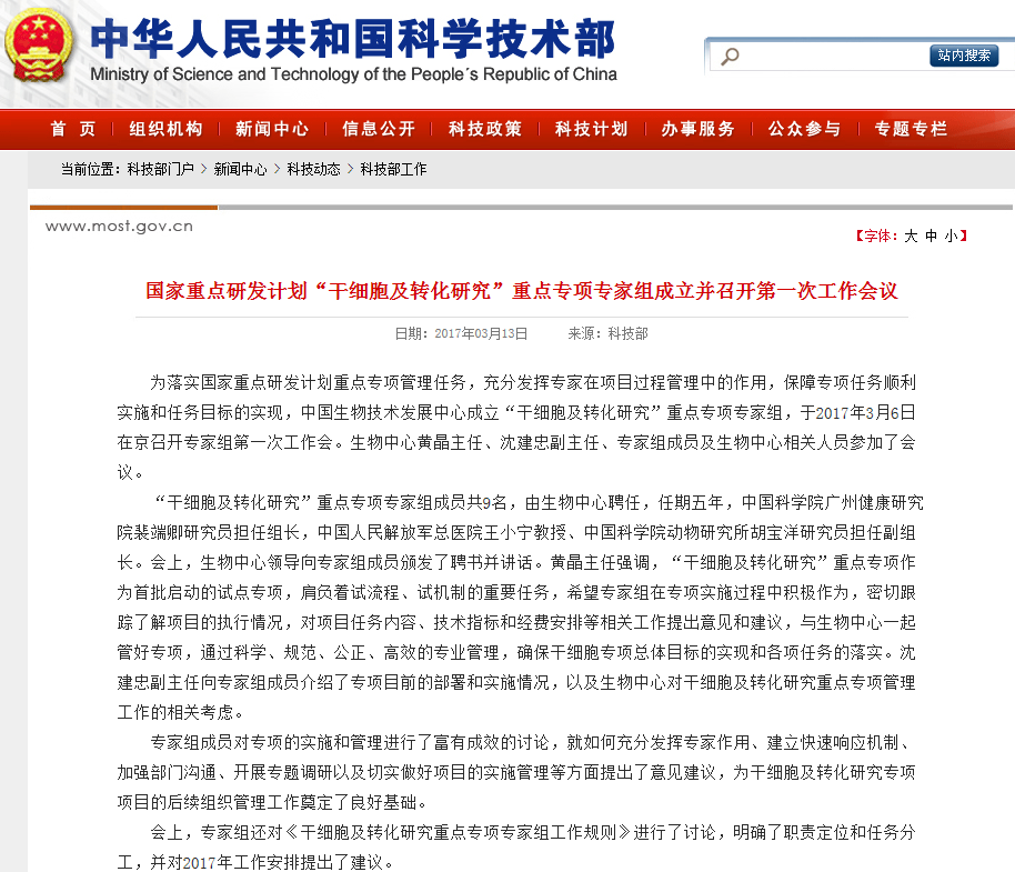 為落實國家重點研發(fā)計劃重點專項管理任務,充分發(fā)揮專家在項目過程管理中的作用,保障專項任務順利實施和任務目標的實現(xiàn),中國生物技術發(fā)展中心成立“干細胞及轉(zhuǎn)化研究”重點專項專家組,于2017年3月6日在京召開專家組第一次工作會。生物中心黃晶主任、沈建忠…