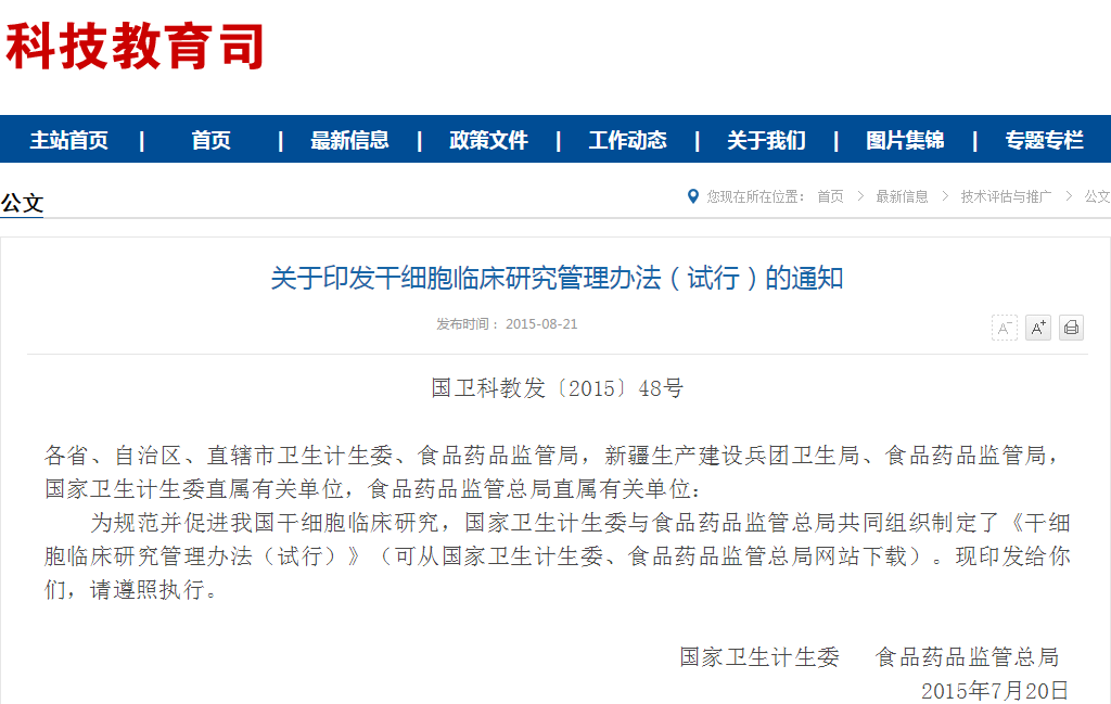 各省、自治區(qū)、直轄市衛(wèi)生計生委、食品藥品監(jiān)管局,新疆生產(chǎn)建設(shè)兵團(tuán)衛(wèi)生局、食品藥品監(jiān)管局,國家衛(wèi)生計生委直屬有關(guān)單位,食品藥品監(jiān)管總局直屬有關(guān)單位:為加強(qiáng)我國干細(xì)胞制劑和臨床研究質(zhì)量管理,國家衛(wèi)生計生委與食品藥品監(jiān)管總局根據(jù)《干細(xì)胞臨床研究管…