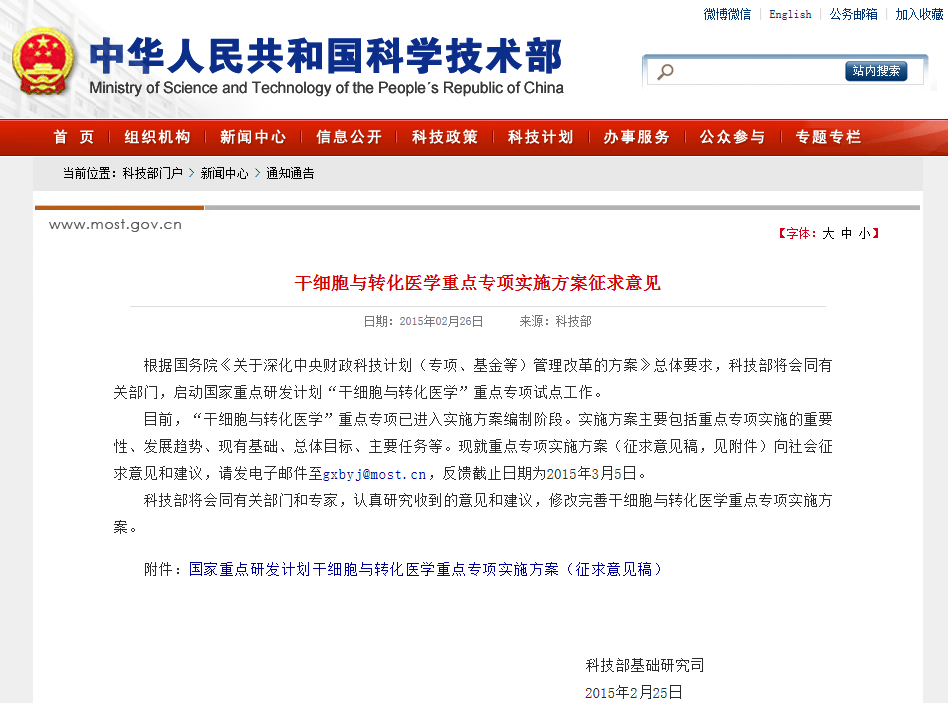 干細(xì)胞與轉(zhuǎn)化醫(yī)學(xué)重點專項實施方案征求意見 根據(jù)國務(wù)院《關(guān)于深化中央財政科技計劃(專項、基金等)管理改革的方案》總體要求,科技部將會同有關(guān)部門,啟動國家重點研發(fā)計劃“干細(xì)胞與轉(zhuǎn)化醫(yī)學(xué)”重點專項試點工作。 目前,“干細(xì)胞與轉(zhuǎn)化醫(yī)學(xué)”重點專項已進(jìn)入…